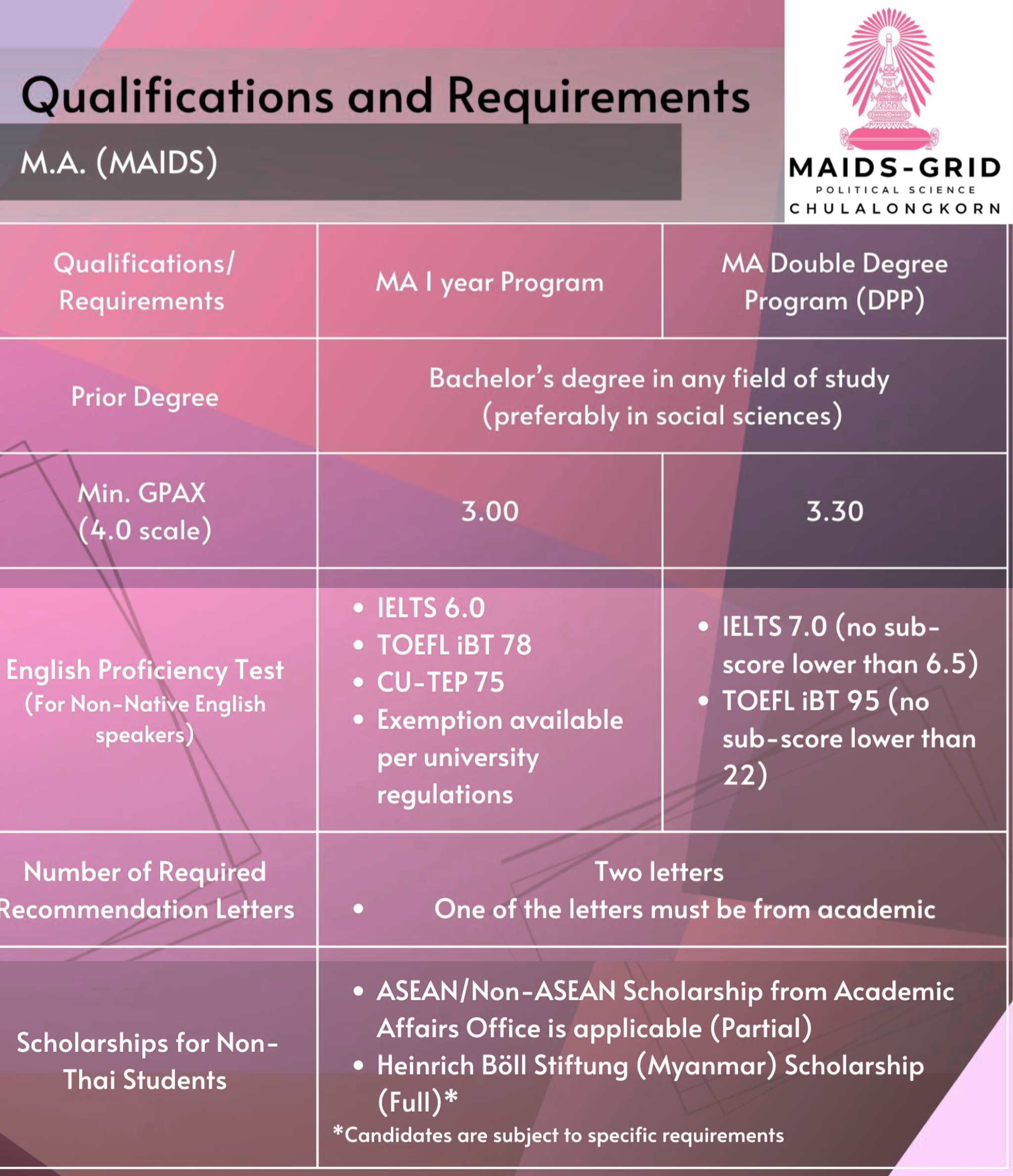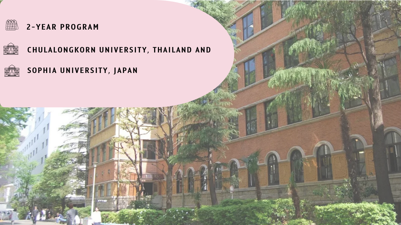 A dual degree program with Sophia University, Japan. The students will study one year at MAIDS, Chulalongkorn University and one year at Sophia University. Students will earn two different Master of Arts degrees upon graduation, one from MAIDS and one from Sophia University.