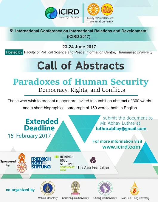 The International Conference on International Relations, Development and Human Rights (ICIRD) will held in Bangkok, Thailand, on 23-24 June 2017, which aims at engaging its participants in the discussion and debates which seek the relevance of different aspects of human (in)security with contemporary global issues, especially the current state of international security.